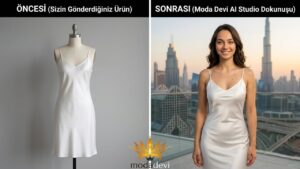 Biz ModaDevi AI Studio‘da sadece “fotoğraf üretmiyoruz”, markanızın ürünlerini dijital dünyada yeniden inşa ediyoruz. Bize sadece telefonunuzla çektiğiniz, basit bir askıdaki ürün fotoğrafını gönderin. Gelişmiş AI algoritmalarımızla bu ürünü dijital ikonumuz Eda’ya giydiriyor, hayalinizdeki mekana yerleştiriyor ve profesyonel aydınlatma ile lüks bir kampanya karesine dönüştürüyoruz.